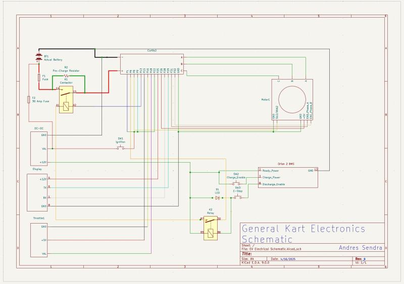 For 2025 EVGrand Prix, the team modified a gas-powered kart with custom EV platform utilizing an Orion BMS, CuicPower battery pack, & Curtis motor controller. Led throttle mapping & low-voltage power distribution design and drafted first versions of KiCAD overall electrical system schematic.
